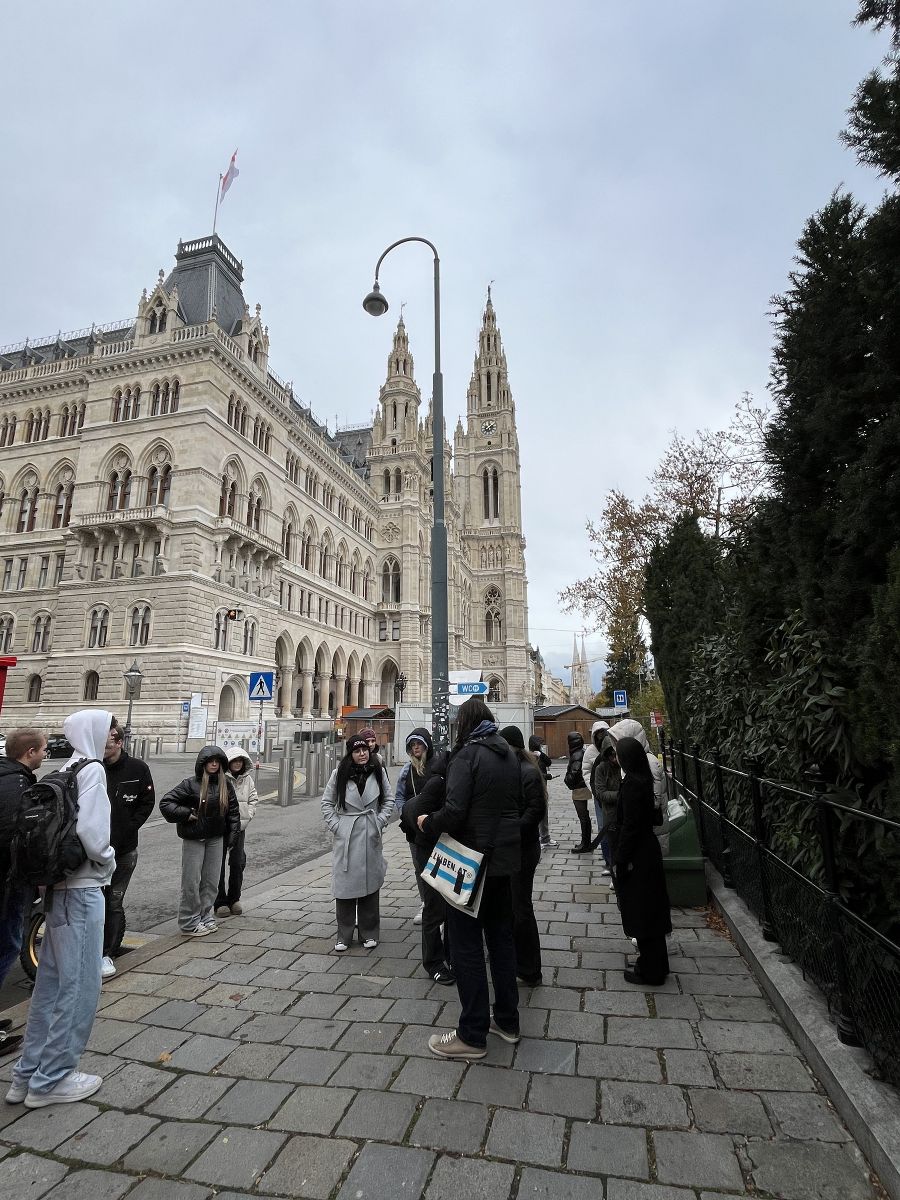 Der Rundgang begann bei der Votivkirche, wo wir erste Einblicke in die historischen Entwicklungen der österreichischen Demokratie erhielten. In unmittelbarer Nähe befindet sich der Wehrmann in Eisen, an dem aufgezeigt wurde, wie Propaganda und nationale Symbolik in Krisenzeiten eingesetzt wurden. Weiter ging es zum Wiener Rathaus, einem zentralen Ort demokratischer Mitbestimmung und kommunalpolitischer Verantwortung. Ein besonderer Schwerpunkt lag anschließend beim österreichischen Parlament, dem Herzstück der parlamentarischen Demokratie in Österreich. Zum Abschluss besuchten wir das Denkmal der Republik, das an die Errichtung der Republik am 12. November 1918 erinnert.